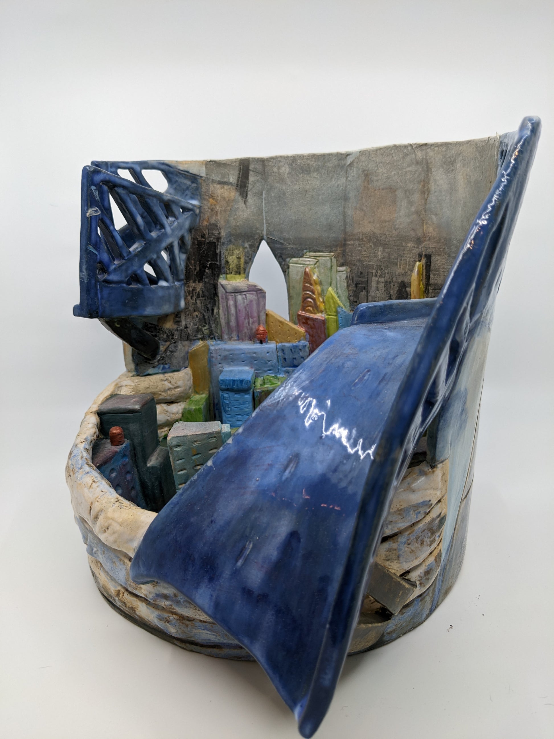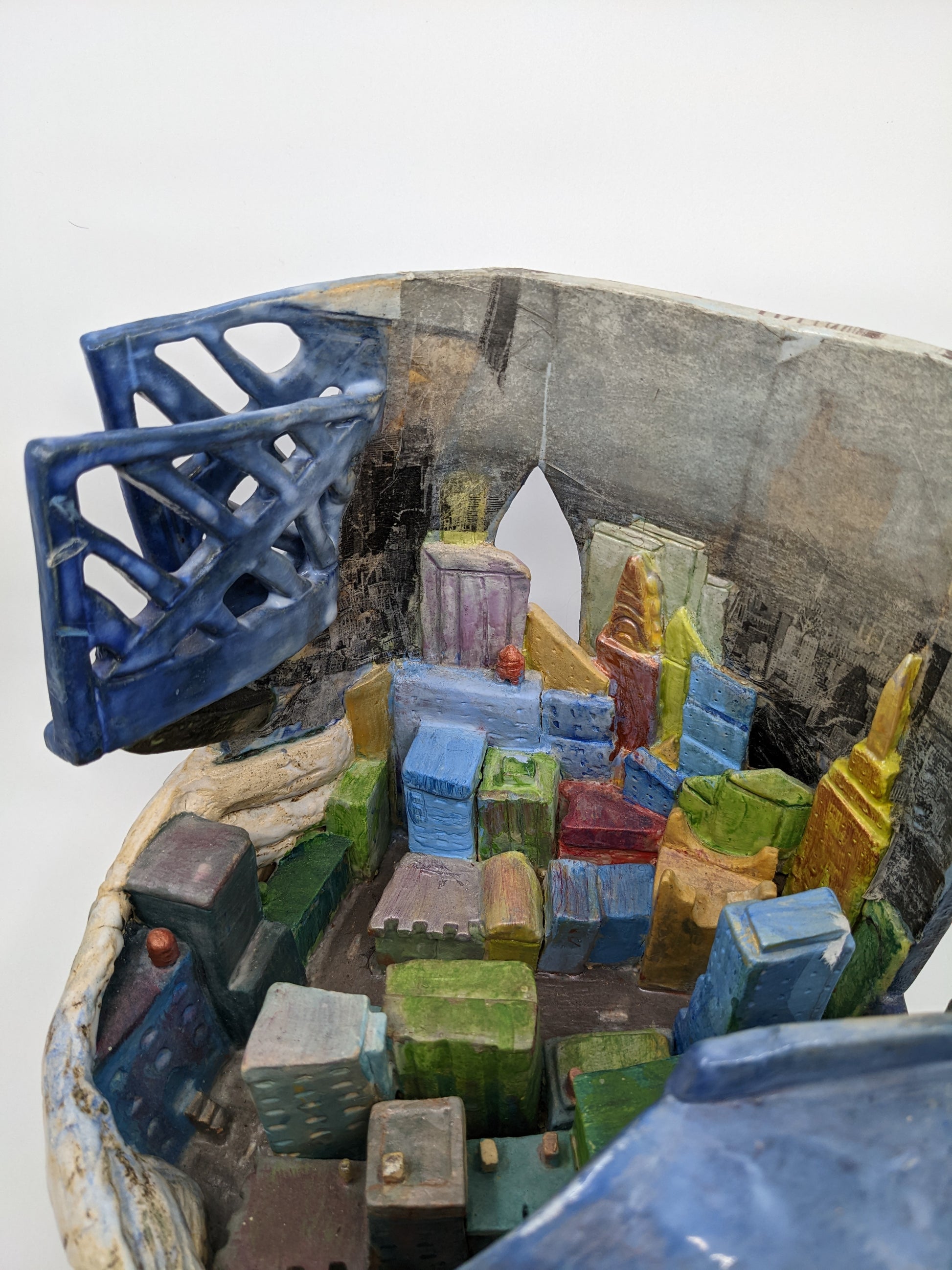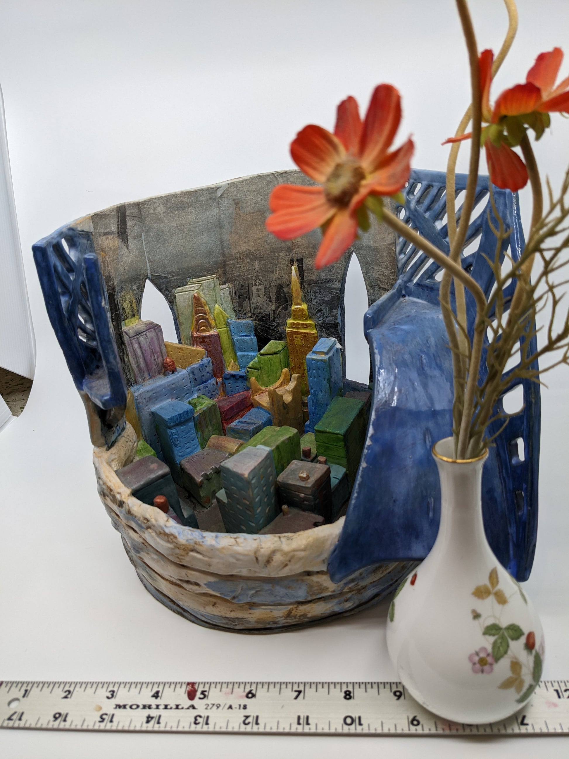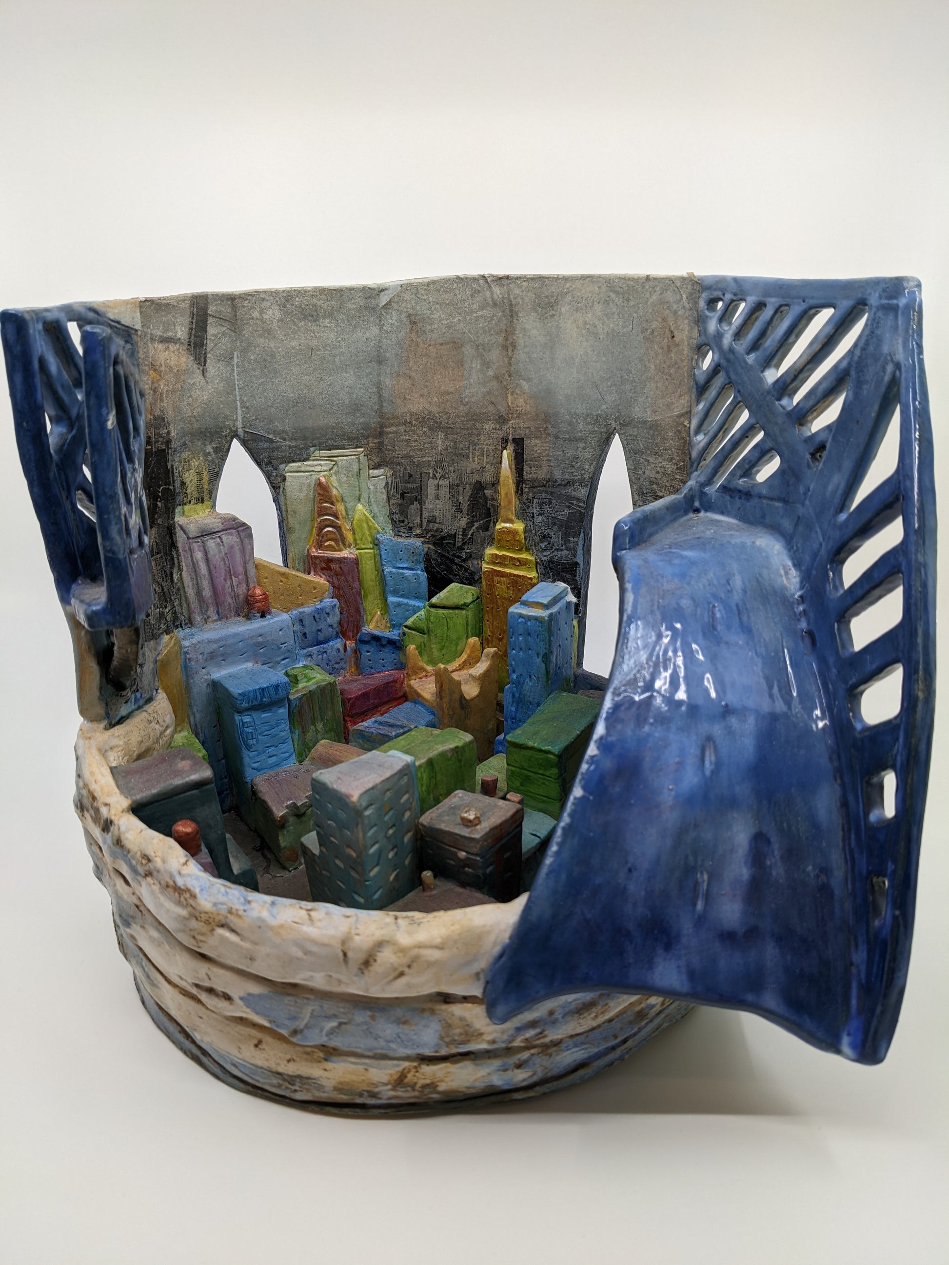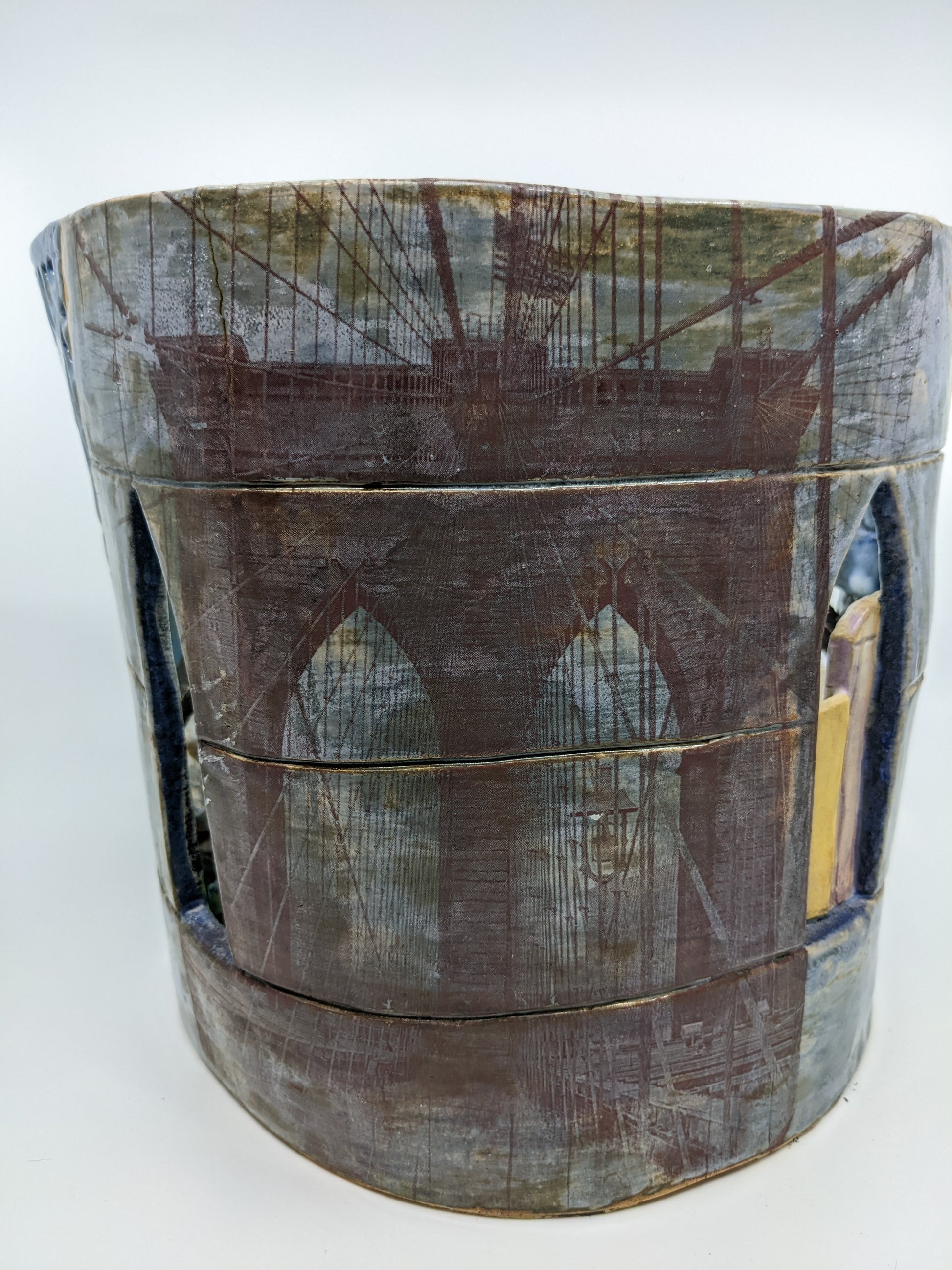 I created space and dimension in the front of this piece and the use of a decal of the Brooklyn Bridge on the rear. Size: 11"L x 10"W x 9"H