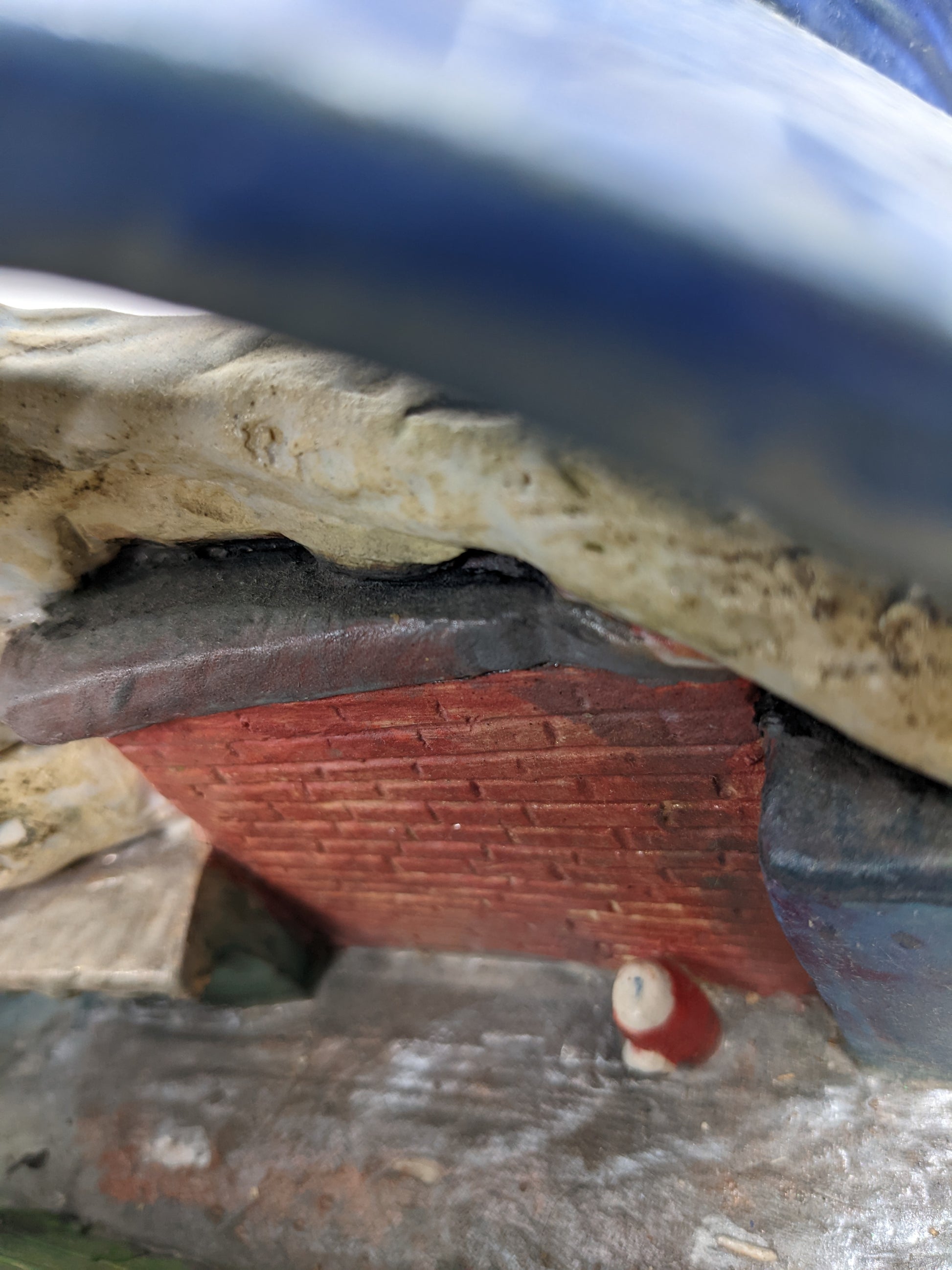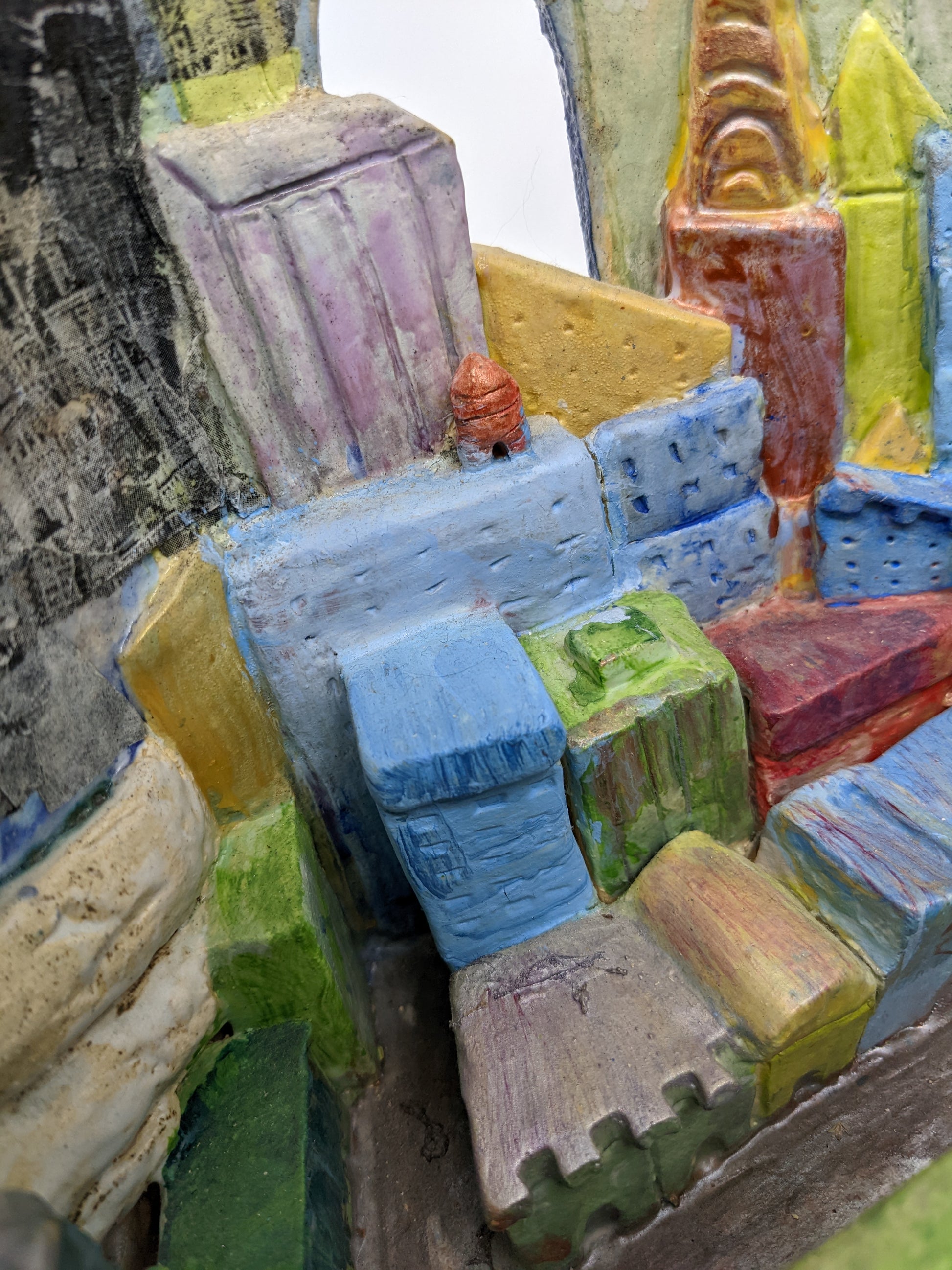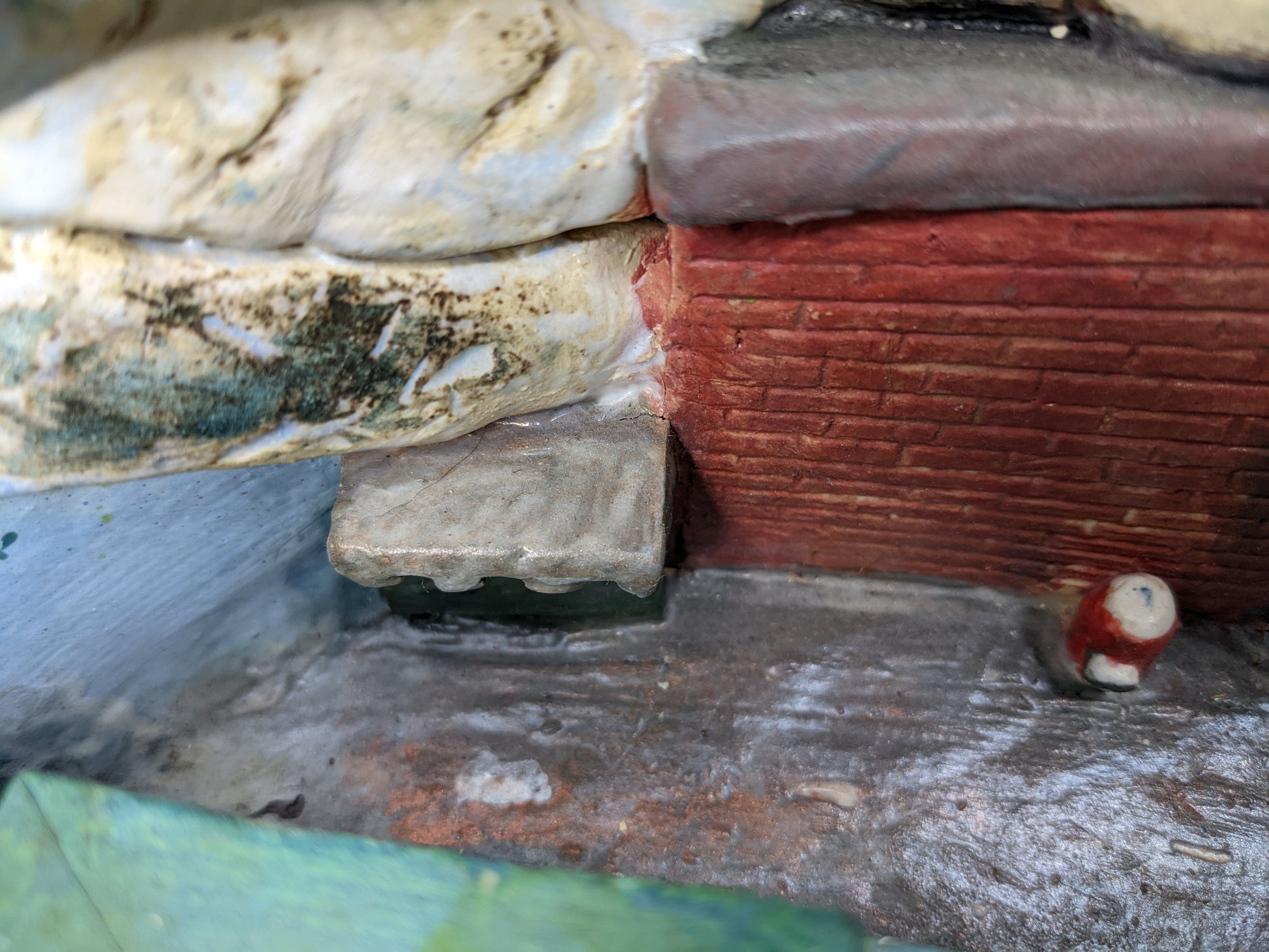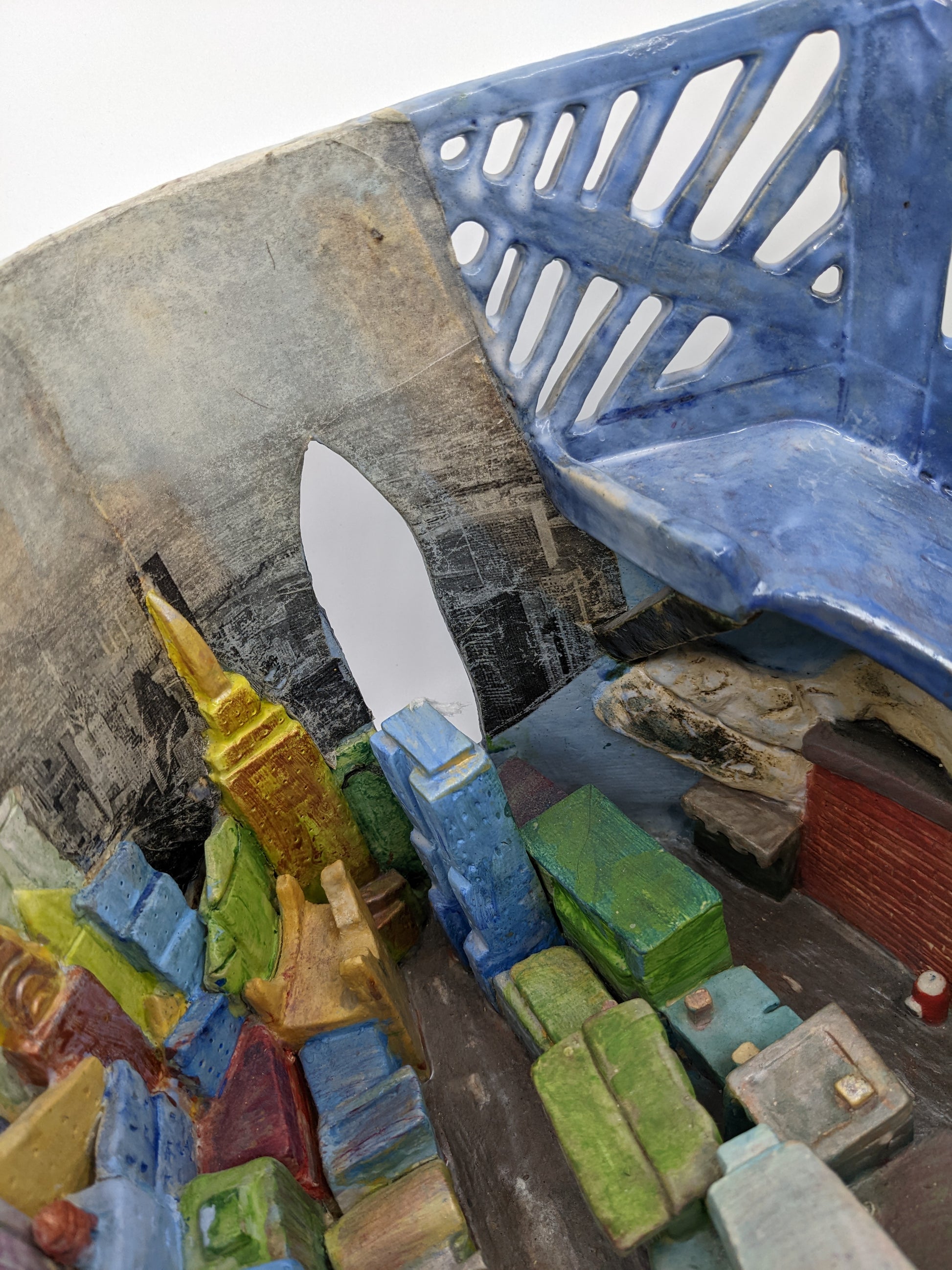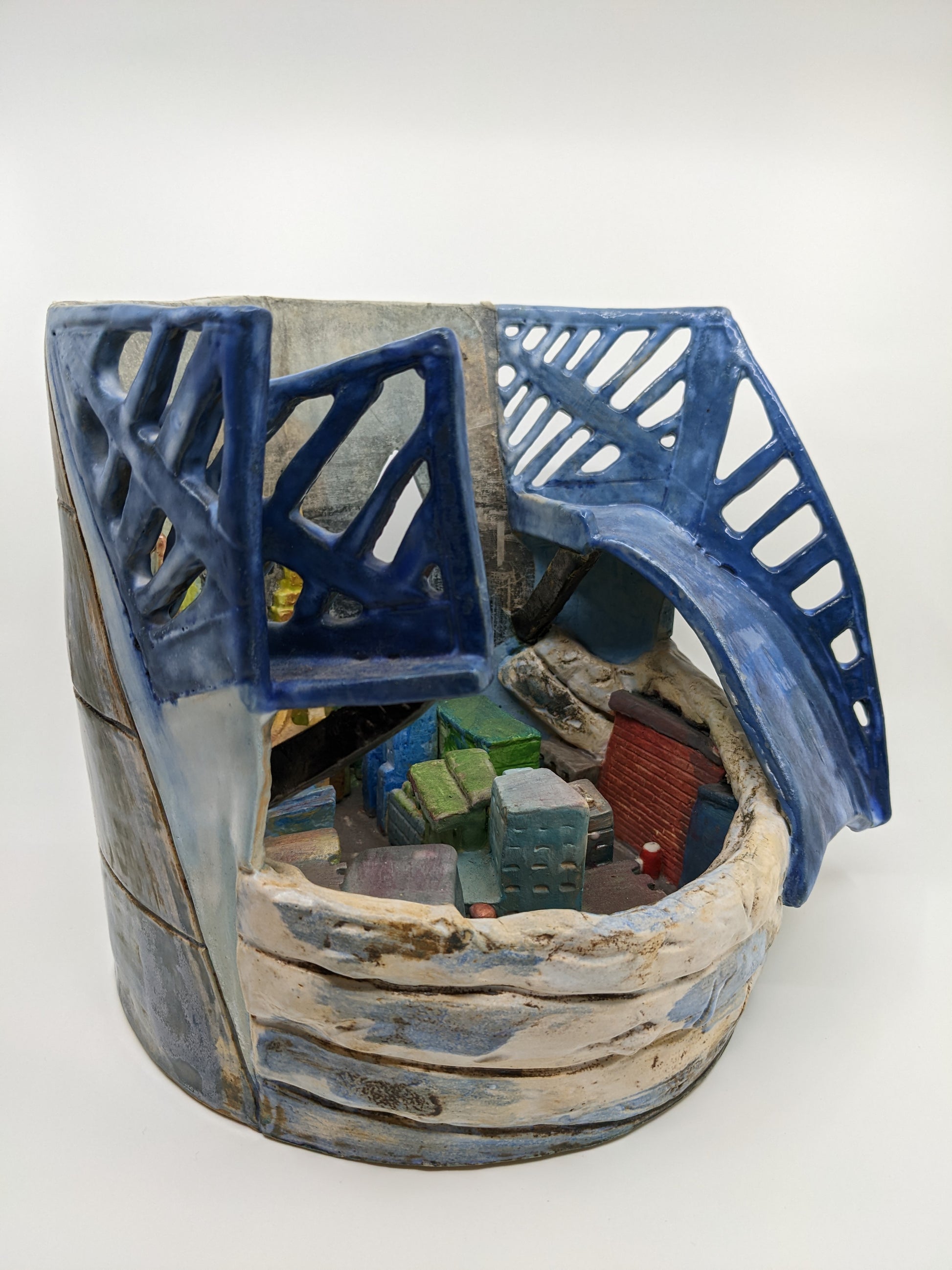 I created space and dimension in the front of this piece and the use of a decal of the Brooklyn Bridge on the rear. Size: 11"L x 10"W x 9"H