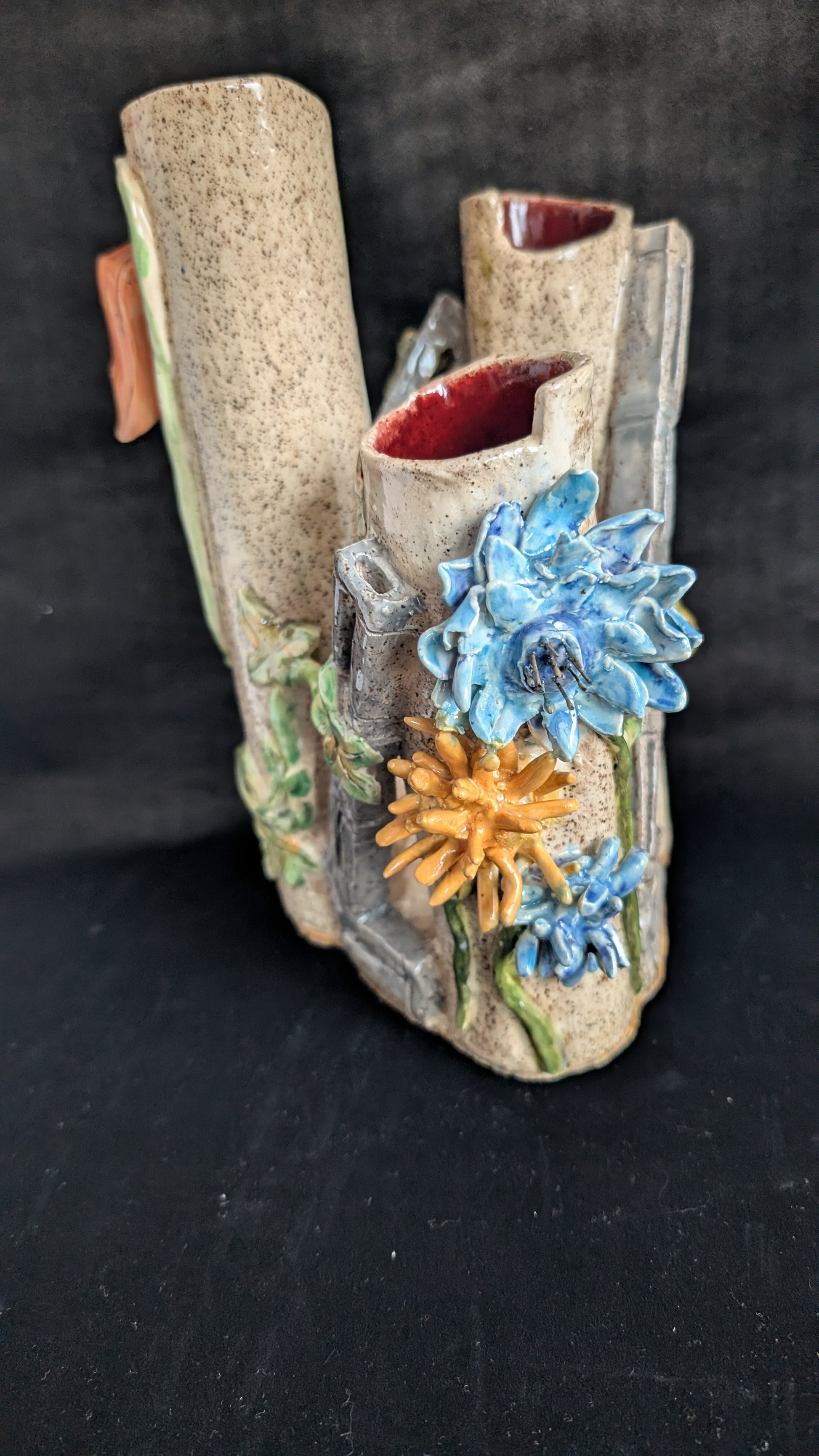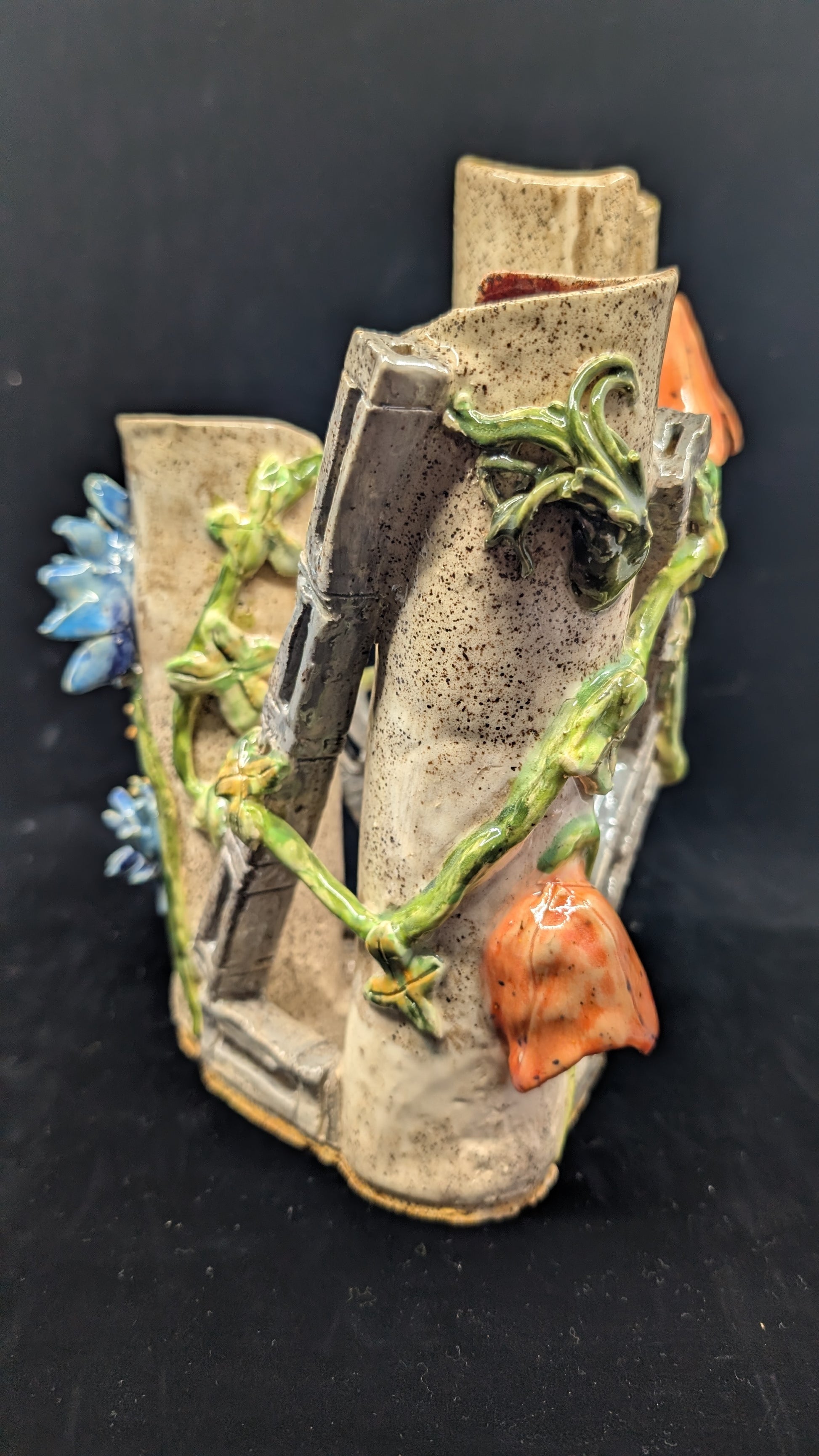 For single stems or many options, this stonewear piece allows more than one arrangement to be displayed. Dahlia and Fritillaria among ivy with underglaze heighten the effect.